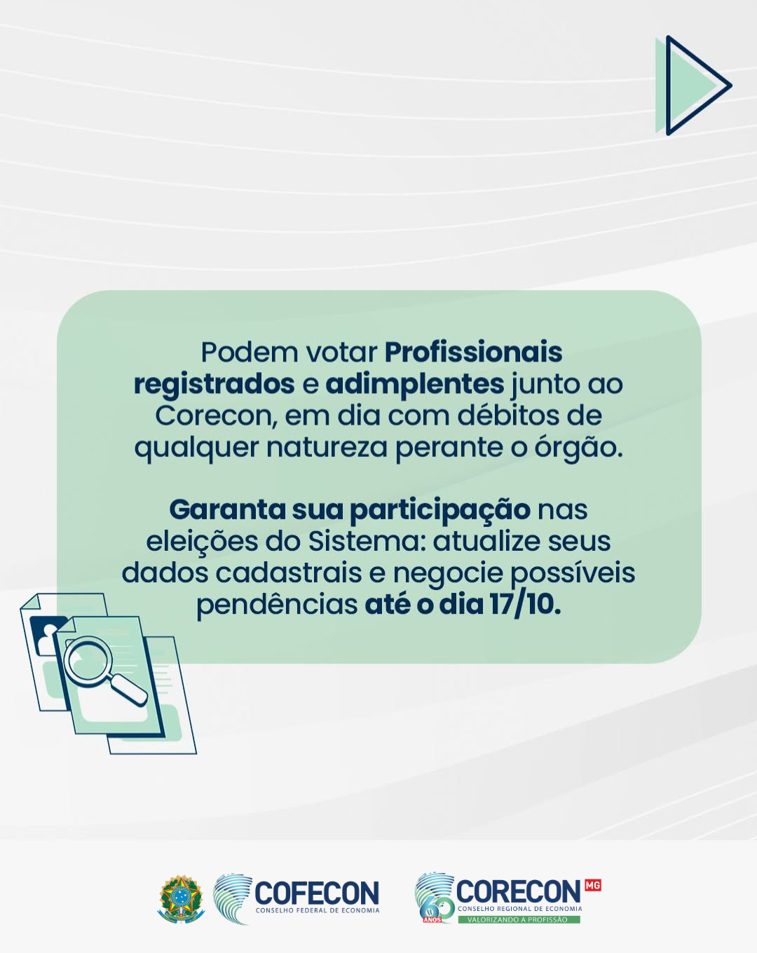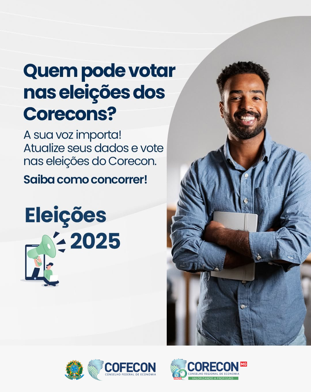 O processo eleitoral é um momento essencial para o fortalecimento da profissão e da representatividade dos economistas. Para garantir seu direito ao voto, é fundamental que você esteja com seus dados cadastrais atualizados junto ao Corecon, especialmente e-mail e número de celular, até o dia 17 de outubro.