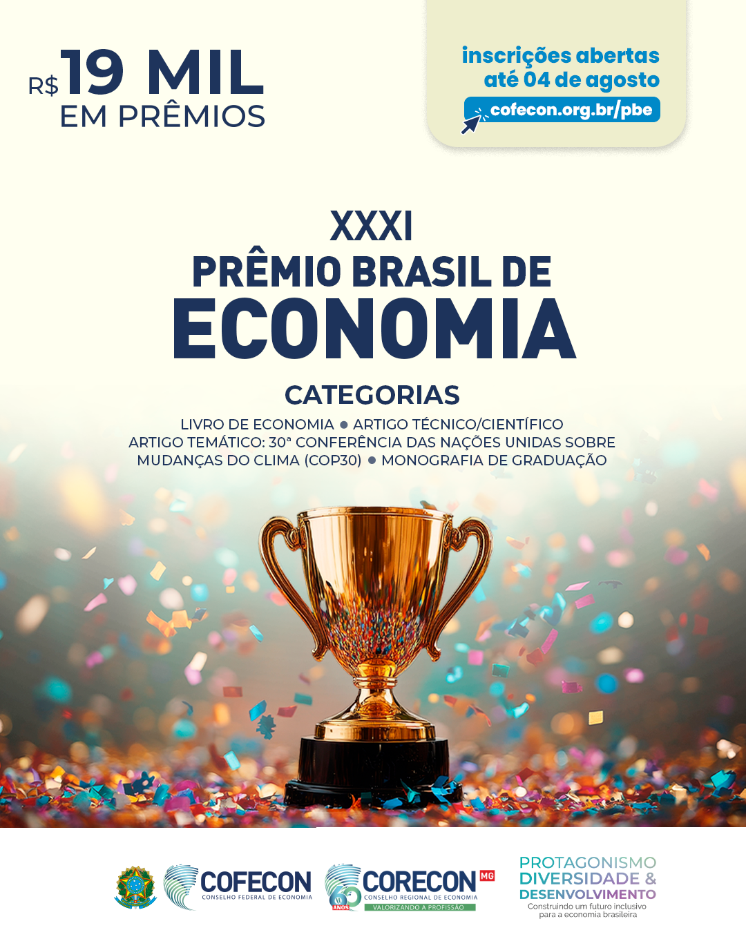 Estão abertas até o dia 04 de agosto as inscrições para o XXXI Prêmio Brasil de Economia. O concurso é promovido anualmente pelo Conselho Federal de Economia com o objetivo de incentivar a investigação econômica e valorizar a produção de conhecimento voltada para a realidade brasileira. Ao todo serão distribuídos R$ 19 mil em prêmios. As inscrições são gratuitas e podem ser feitas no site www.cofecon.org.br/pbe.